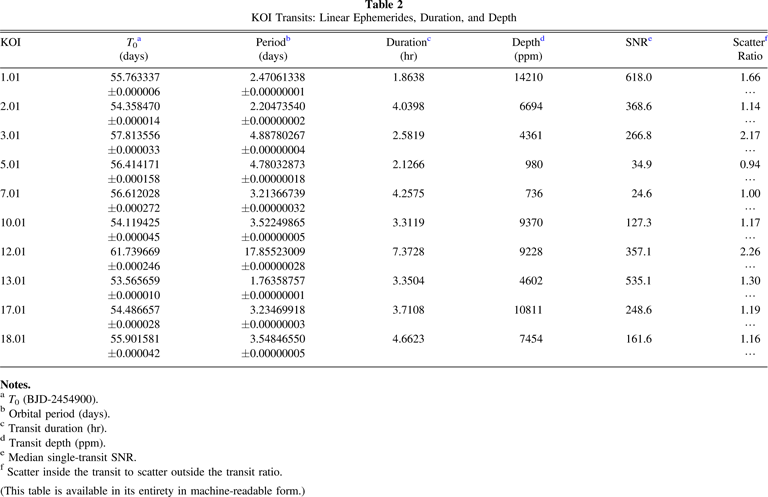 Table 2. KOI Transits: Linear Ephemerides, Duration, and Depth