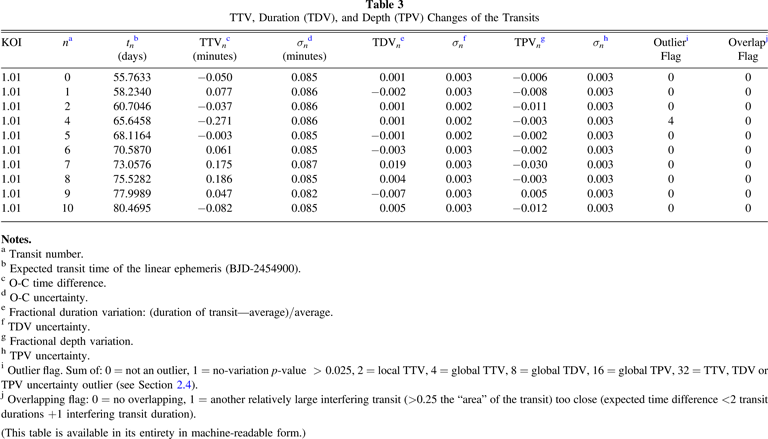 Table 3. TTV, Duration (TDV), and Depth (TPV) Changes of the Transits