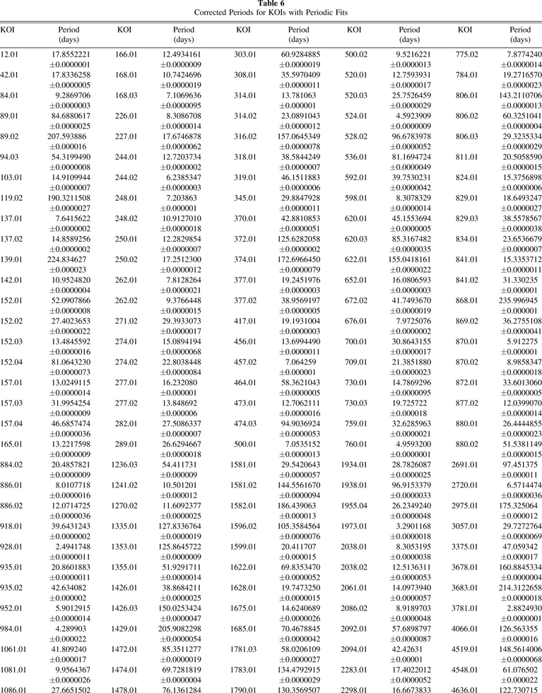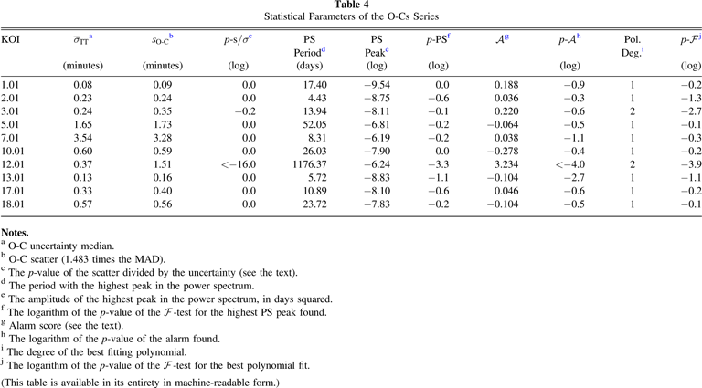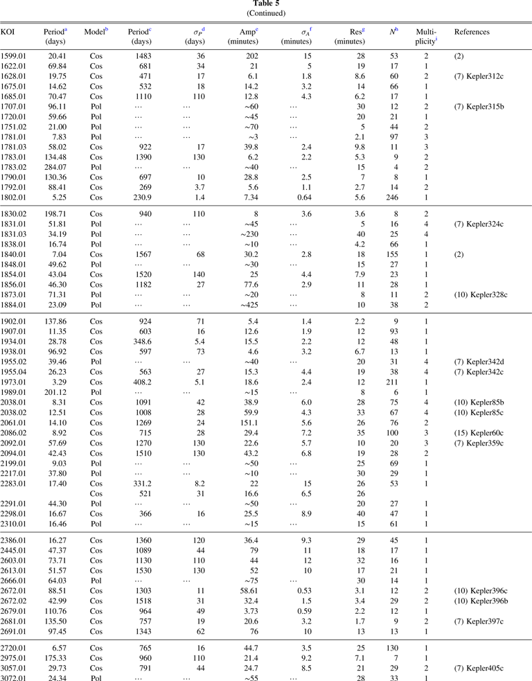 | KOI | T0a | Periodb | Durationc | Depthd | SNRe | Scatterf |
