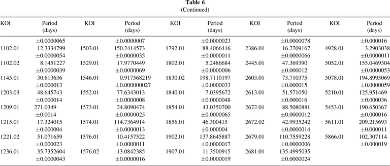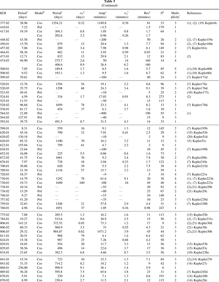 | 500.04 | 500.02 | 4.6453 | 9.5216 | 0.0249 | 2:1 | ⋯ | ⋯ | 193 | 1 | 190 | (2),(17) Kepler80 |