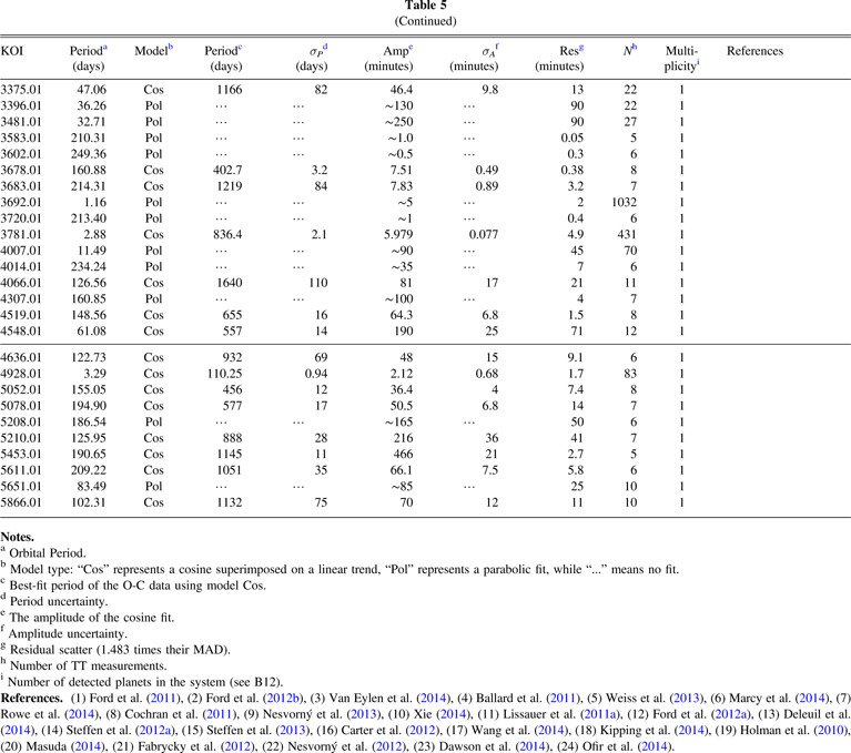 from the median of the O-Cs of that KOI, if the O-Cs were randomly distributed. We used N ≤ 100, even for systems with larger number of points. We have found 23,030 such outlier transits. - 4.TDV global outlier—A transit was labeled as an outlier when its TDV deviated from zero by at least five times the scatter of all TDVs of that KOI plus three times their median error. We have found 195 such transits.
