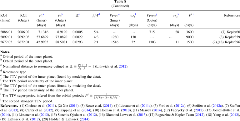 References. (1) Cochran et al. (2011), (2) Xie (2014), (3) Rowe et al. (2014), (4) Lissauer et al. (2011a), (5) Ford et al. (2012a), (6) Steffen et al. (2012a), (7) Steffen et al. (2013), (8) Carter et al. (2012), (9) Kipping et al. (2014), (10) Holman et al. (2010), (11) Masuda (2014), (12) Fabrycky et al. (2012), (13) Jontof-Hutter et al. (2014), (14) Lissauer et al. (2013), (15) Sanchis-Ojeda et al. (2012), (16) Diamond-Lowe et al. (2015), (17) Ragozzine & Kepler Team (2012), (18) Yang et al. (2013), (19) Lithwick et al. (2012), (20) Hadden & Lithwick (2014).