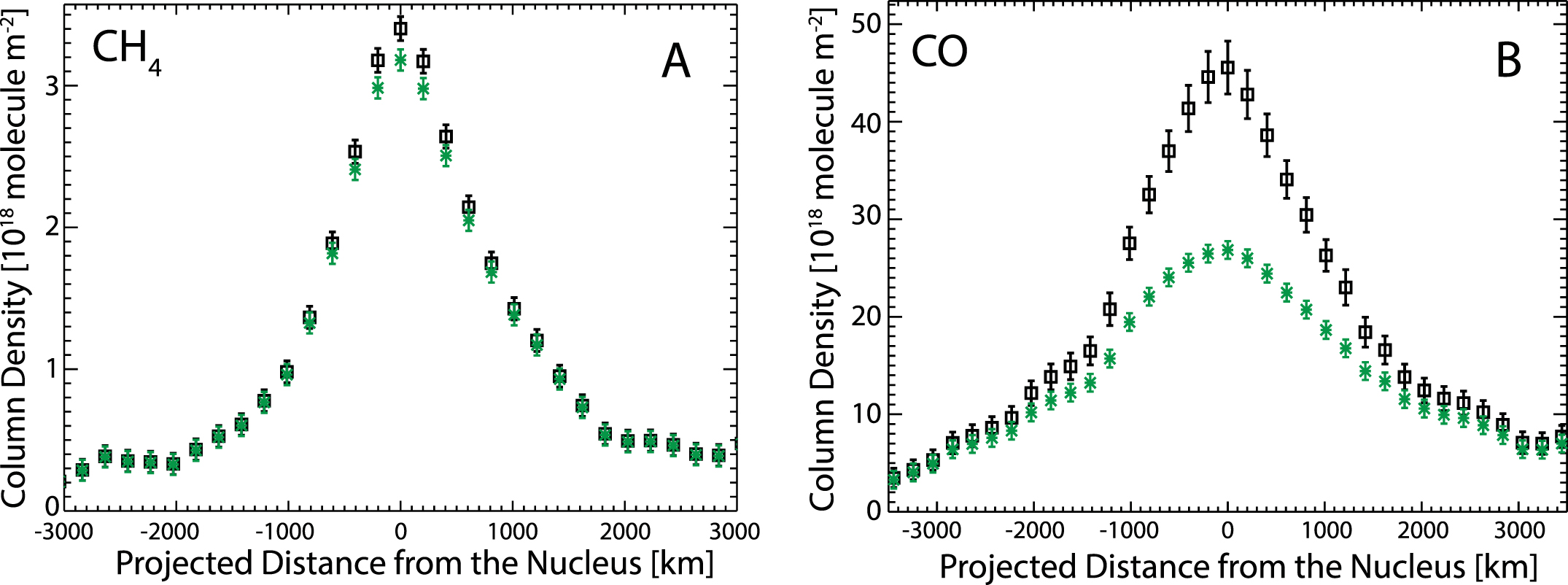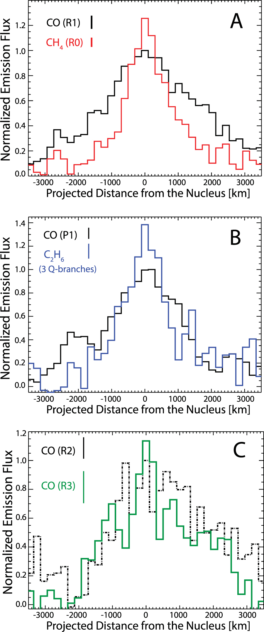 We measured the spatial intensity distribution of individual lines of CO and CH4 at 3.25 au. The spatial profiles of the R1 and R0 lines of CH4 are nearly identical, but CO exhibits a different spatial behavior, both to CH4 and also among CO lines. Figure 2(A) compares profiles of the CO (R1) and CH4 (R0) lines. While the CH4 distribution is strongly peaked near the nucleus, the profile of CO is flatter in its central portion and decreases more slowly away from the nucleus than that of CH4.