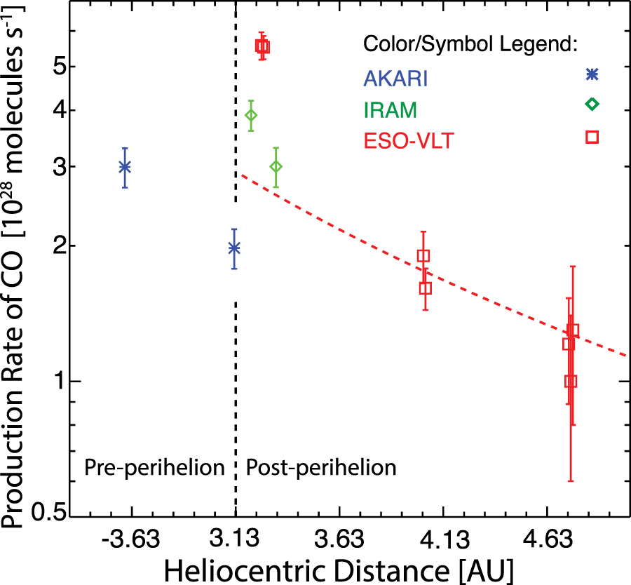 Figure 5. CO production rates as measured by IRAM (green diamonds, Bockelée-Morvan et al. 2010), AKARI (blue stars, Ootsubo et al. 2012), and ESO-VLT (red squares, this work). AKARI and VLT results are based on infrared measurements of the CO 1-0 band vibrational emissions, while IRAM results are based on measurements of the velocity-resolved CO (2-1) rotational line. The red dashed line corresponds to insolation-limited (