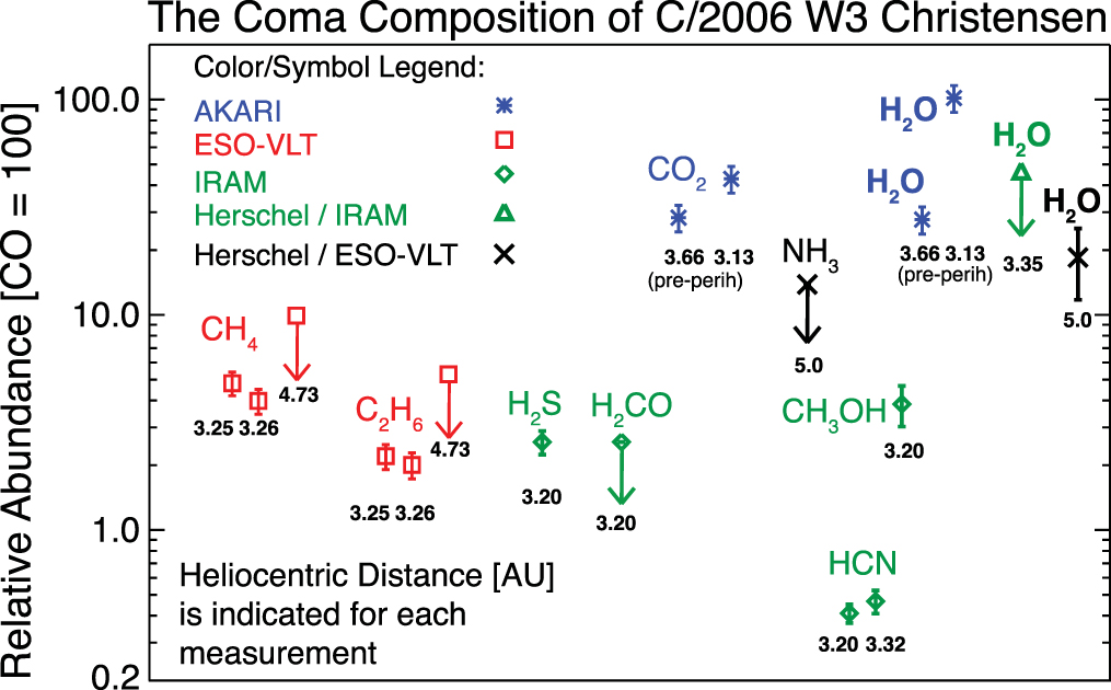 Figure 6. Abundances of species detected in comet C/2003 W3 (Christensen) relative to carbon monoxide based on de Val-Borro et al. (2014), Bockelée-Morvan et al. (2010), Ootsubo et al. (2012), and this work. Measurements from different observatories are marked according to the color/symbol legend in the top left corner of the figure and are explained in the main text (Section 6.2). Heliocentric distance is marked below each individual relative abundance. Unless explicitly indicated, abundances pertain to post-perihelion.