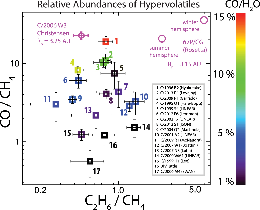Figure 7. Diagram of CO/CH4 vs. C2H6/CH4 including comets C/2006 W3 (Christensen) (this work; Rh = 3.25 au), 67P/Churyumov-Gerasimenko (Le Roy et al. 2015; Rh = 3.15 au), and 17 comets observed between Rh of 2 au and 0.35 au (after Mumma & Charnley 2011; Paganini et al. 2014, and DiSanti et al. 2014, 2016). The value for C/2006 W3 is based on independent measurements on two different dates, which are in agreement (Table 3). Note that the 67P ratios are based on in situ mass spectroscopy (see Section 6.3) and therefore their interpretation against line-of-sight-integrated remote-sensing measurements is not straightforward. Each comet observed inside Rh ∼ 2 au is numbered according to the legend inserted in a gray box in this graphic. The CO/H2O ratio for these comets is color-coded. Importantly, the CO/H2O ratio in C/2009 P1 (point 3) increased with time, reaching ∼60% as the comet approached 2 au post-perihelion (Feaga et al. 2014).
