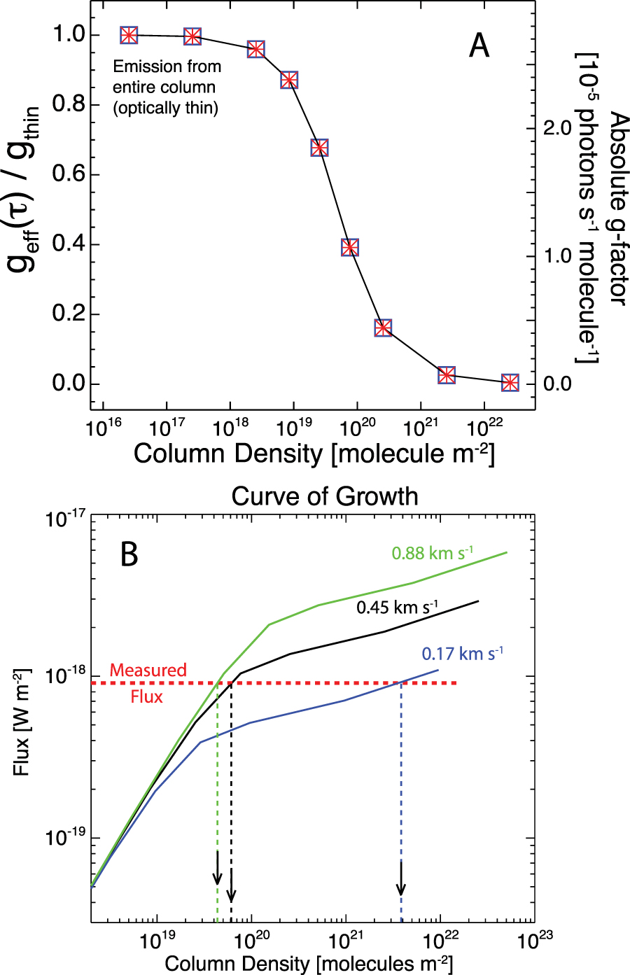 (τ) (W molecule−1), we can retrieve the column density from the measured line flux by modeling the curves of growth for individual emission lines. A representative example with three curves of growth for CO is shown in Figure 8(B). The x-axis covers a wide range of assumed column densities. The y-axis shows the predicted flux at geocentric distance Δ [m] for a field of view (FoV) with a projected area at the comet