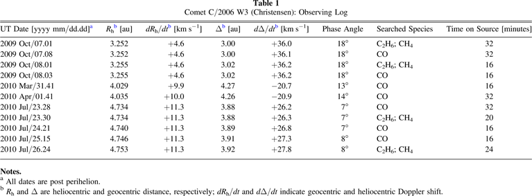 | UT Date [yyyy mm/dd.dd]a | Rhb [au] | dRh/dtb [km s−1] | Δb [au] | dΔ/dtb [km s−1] | Phase Angle | Searched Species | Time on Source [minutes] |