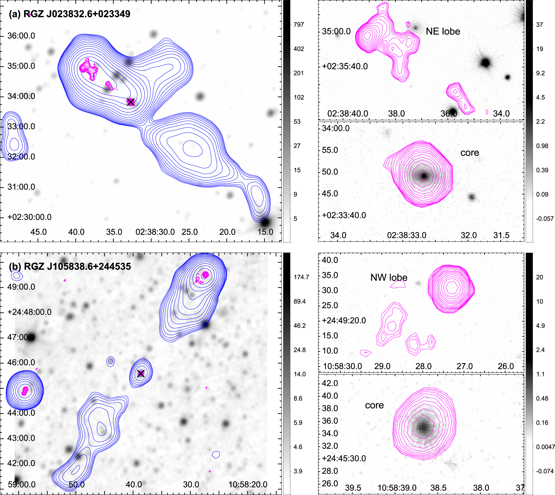 mJy beam−1 (NVSS). WISE: the colorbars are in log scale and are in the raw intensity units of DN/pixel. Hosts of the radio galaxies are marked with crosses. Right: zoom in on components detected in FIRST overlaid on SDSS DR13