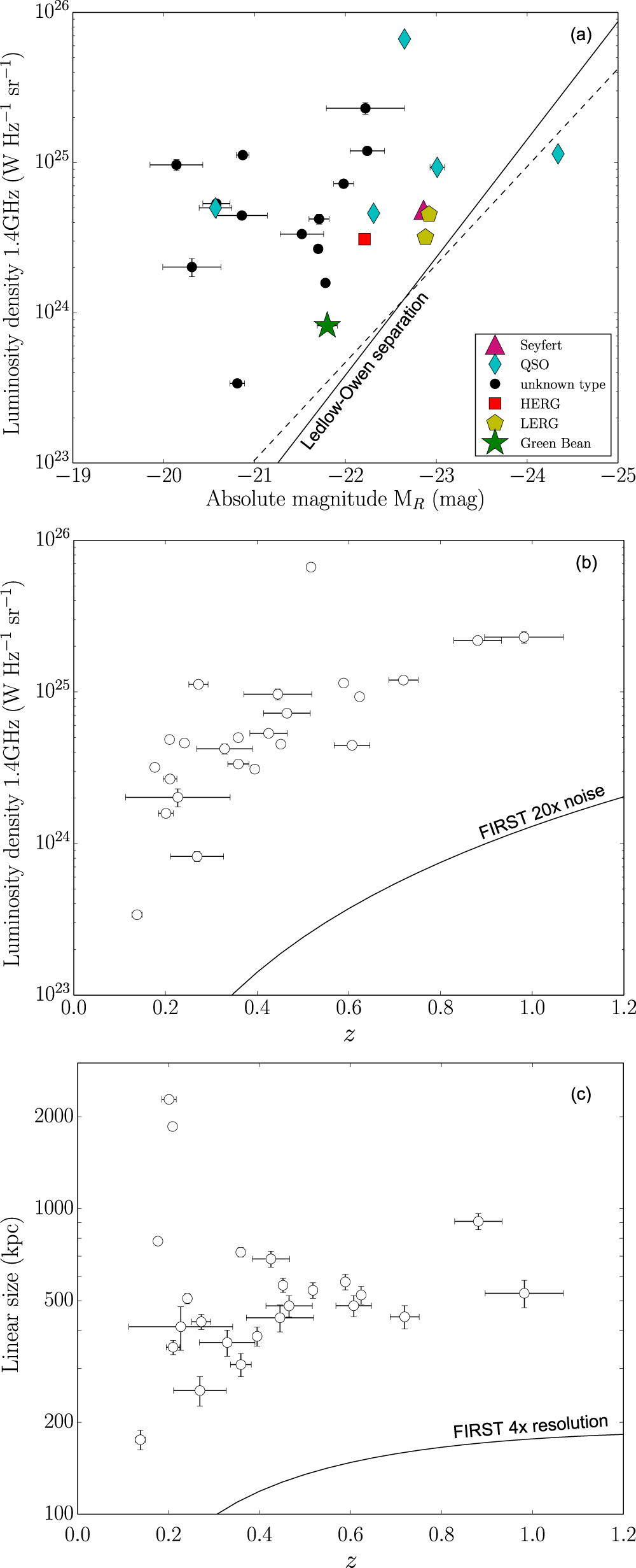 Our sources display a range of linear sizes, from 175 kpc to megaparsec-scales, with two sources classified as giant radio galaxies (Figure 3(c)). The apparent scarcity of low luminosity and small linear size sources in our selection may be artificial, however; simply, we are less likely to select faint (