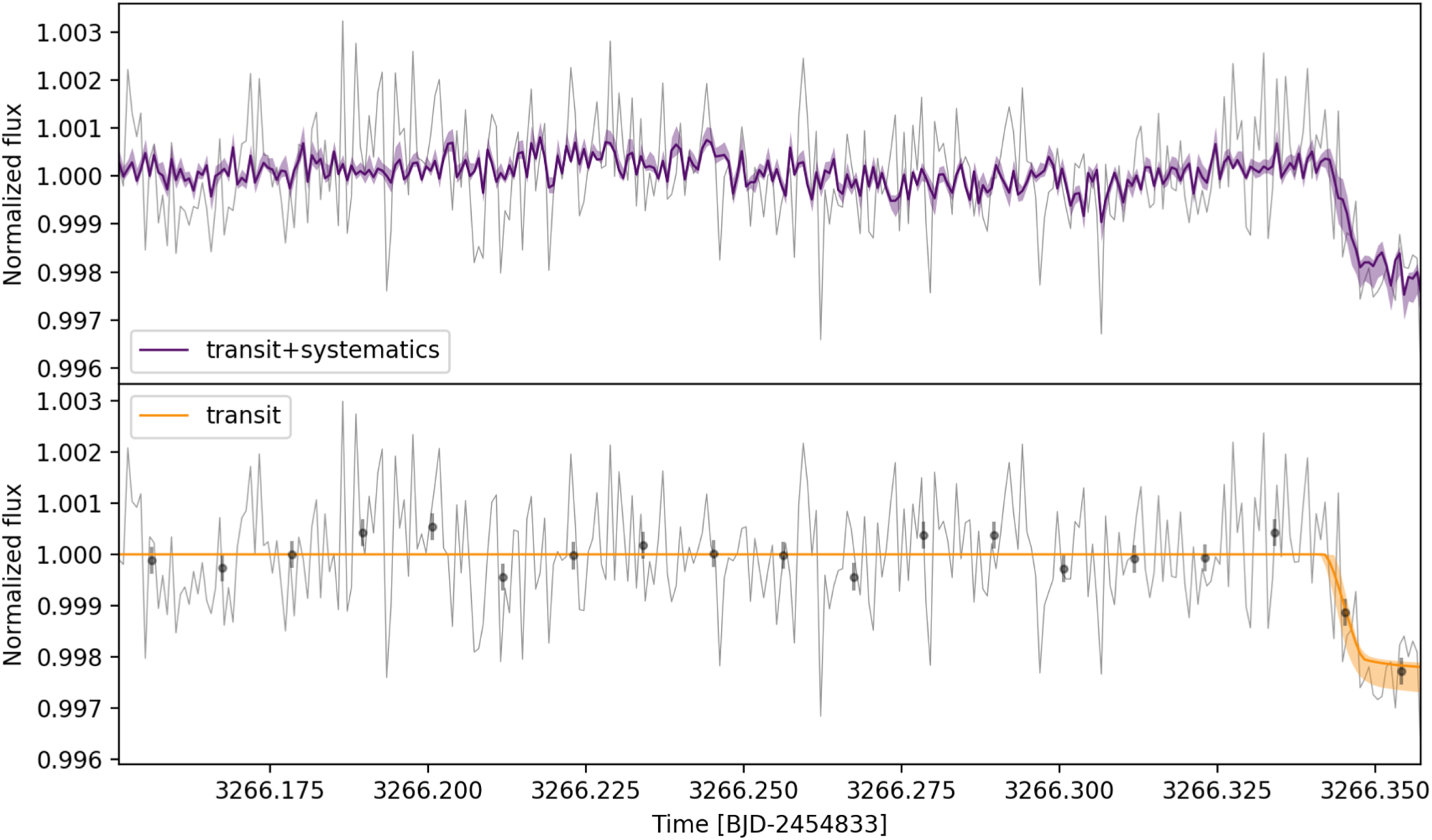 Figure 10. Top: Raw Spitzer photometry and best-fit model of the transit and systematics, with shaded 68% credible region. Bottom: Corrected light curve and best-fit transit model, with shaded 68% credible region. A partial transit of the planet was caught at the end of the observing sequence.