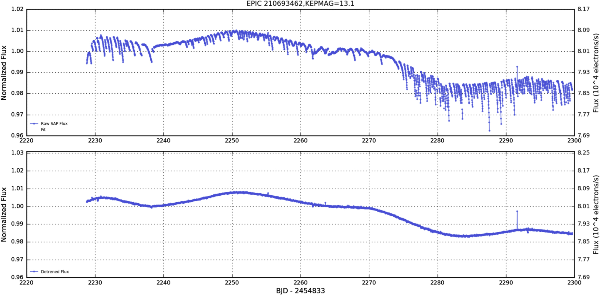 Figure 1. Top: Raw K2 photometry of EPIC 210693462 displaying time and roll dependent spacecraft systematics. Bottom: systematics corrected, detrended light curve.