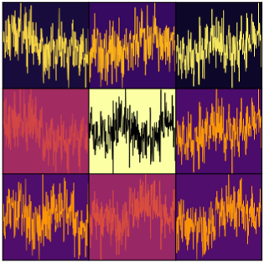 Figure 8. A qualitative visualization of the individual pixel light curves used to model the Spitzer systematics via PLD, arranged in a 3 × 3 grid and colored according to their position and flux on the IRAC detector. Each pixel light curve is normalized such that the sum of all 9 pixels at each timestep is unity (see Section 5.2.1); the normalization removes astrophysical variability, enabling correlated instrumental noise to be visible on multiple timescales.