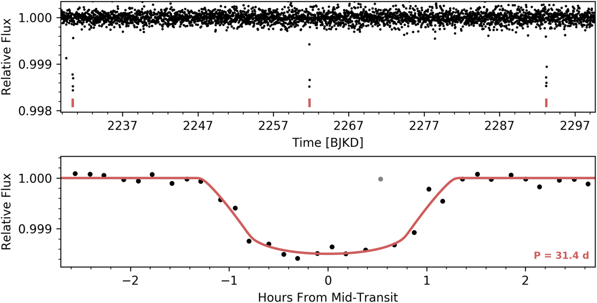 Standard image High-resolution imageFigure 9. Top: K2 light curve produced by EVEREST 2.0 with individual transits indicated in red. Bottom: the same light curve folded on the orbital period with best-fit transit model in red. The data point in gray was identified as an outlier and ignored in the fit.