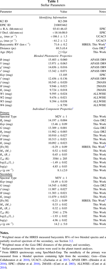 aWeighted mean of the HIRES measured barycentric RVs of two blended spectra and a partially resolved spectrum of the secondary, see Section 3.2. bWeighted mean of the Gaia DR2 distances of the primary and secondary. cStellar parameters from this section were used in the planet transit analyses. dFrom HIRES spectroscopy using SpecMatch-Emp. The metallicity of the primary was measured from a blended spectrum containing light from the secondary; Gaia—(Gaia Collaboration et al. 2018), UCAC5—(Zacharias et al. 2017), APASS DR9—(Henden et al. 2016), EPIC—(Huber et al. 2016), 2MASS—(Cutri et al. 2003), ALLWISE—(Cutri et al. 2014).Download table as: ASCIITypeset image