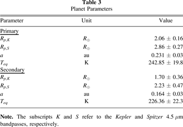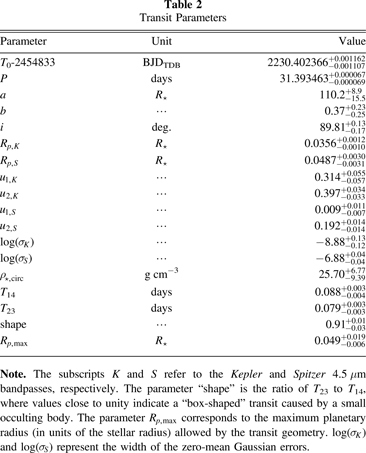 Note. The subscripts K and S refer to the Kepler and Spitzer 4.5 μm bandpasses, respectively. The parameter "shape" is the ratio of T23 to T14, where values close to unity indicate a "box-shaped" transit caused by a small occulting body. The parameter