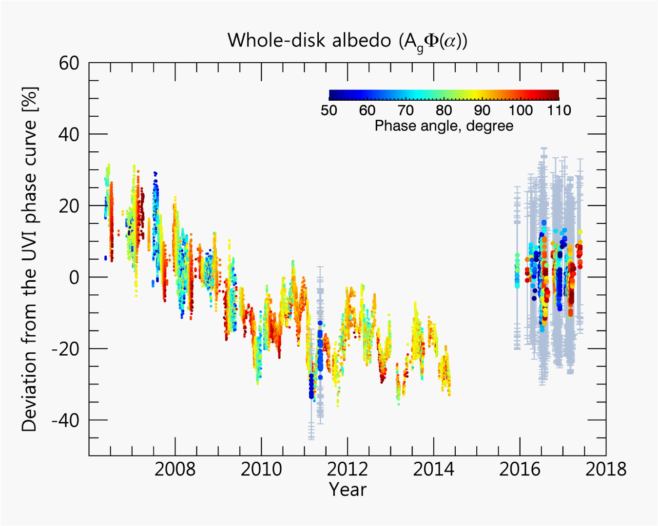 Figure 10. Deviations of the whole-disk albedo, Awhole-disk, of all VMC (2006–2014) and UVI (2011, 2015–2017) data. Vertical bars of UVI correspond to the 18% error in the absolute radiance inferred from the star calibration. The symbol colors indicate the phase angle, as defined in the color bar.