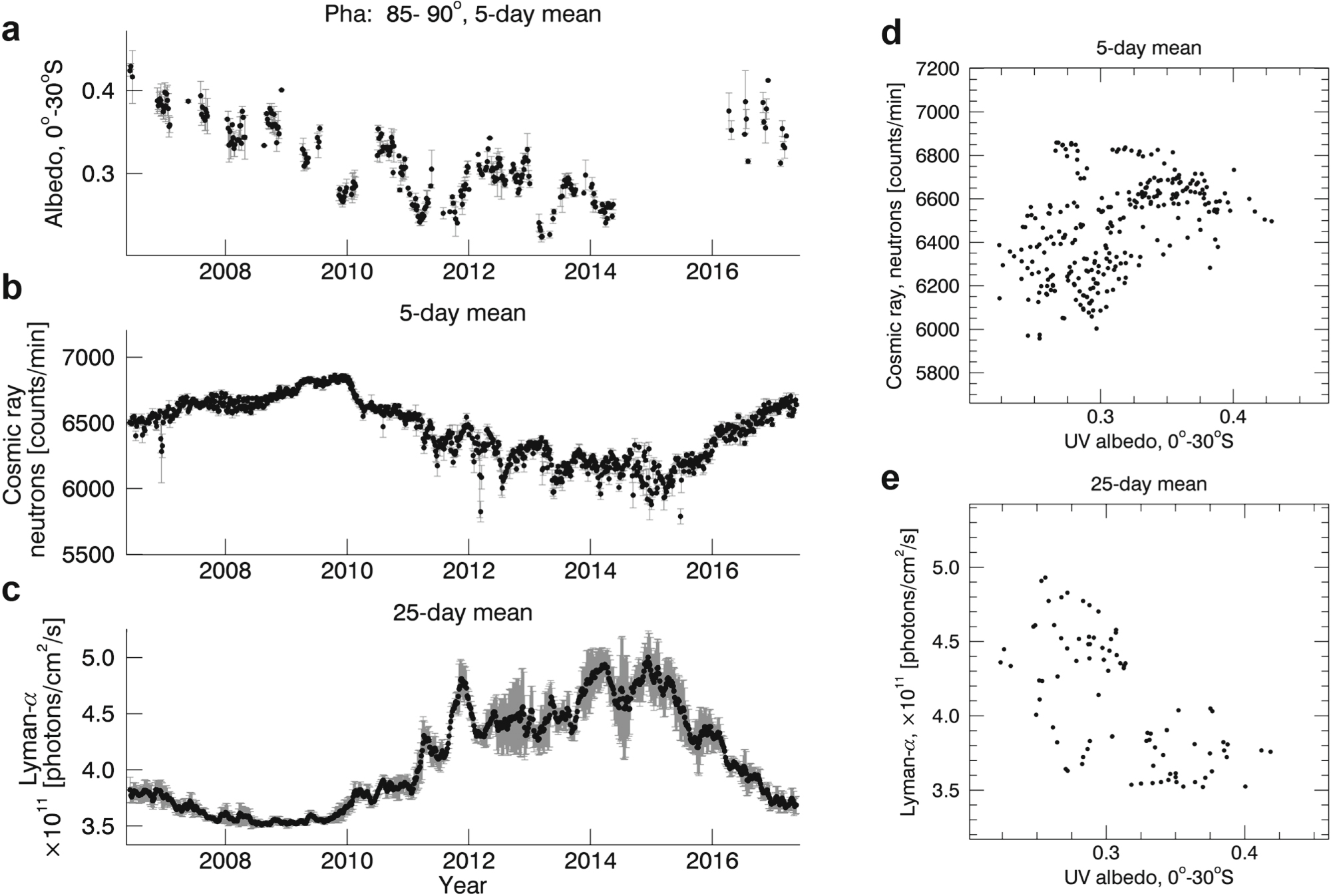 Figure 15. Comparison of the 365 nm albedo A, neutron cosmic rays, and Ly-α flux density evolution with time. On each date, the 5 day mean of low-latitudinal A at the 85°–90° phase angle bin (a), the 5 day mean of cosmic rays (neutron) measured at the Oulu station (b), and the 25 day mean of the Ly-α flux (c) is shown. A comparison between (a) and (b) is shown in (d). A comparison between (a) and (c) is shown in (e) but uses the 25 day mean for consistency. See text for details.