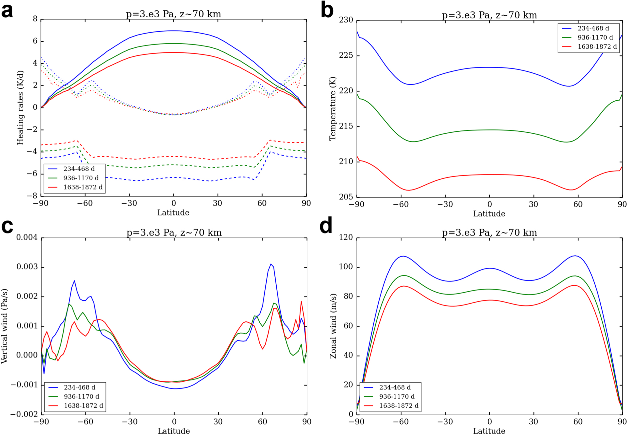 Figure 16. Latitudinal heating rate (a), temperature (b), vertical winds (c), and zonal winds (d) at 30 mbar (∼70 km) in the same simulation shown in Figure 14. All parameters are averaged zonally over 2 Venusian solar days, as shown in the legend of each panel. In (a), solar heating (solid lines), thermal heating (dashed lines), and adiabatic heating (dotted lines) are compared, and negative values mean cooling.