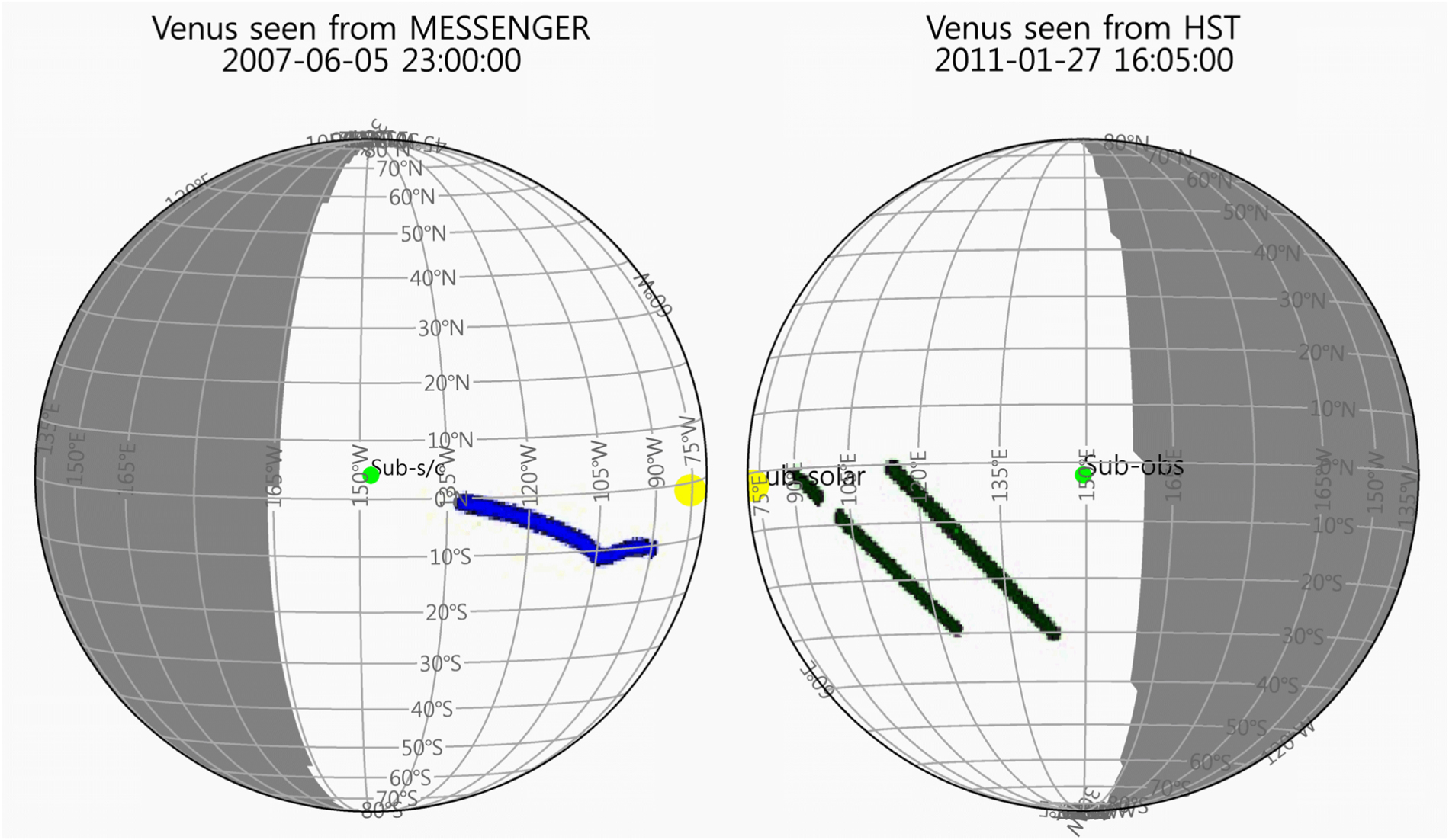 Figure 1. Viewing geometries of spectral data. (Left) MASCS on 2007 June 5 at 72° of spacecraft center of the Venus–Sun (phase) angle position. The blue data points were acquired at the 85°–90° phase angles following the progress of the spacecraft during its flyby. (Right) STIS on 2011 January 27 as seen at 79° phase angle. White is dayside, and the shaded area is nightside. Blue and dark green filled symbols indicate spectral data locations. Yellow symbols are subsolar points, and light green symbols are a sub-MESSENGER and sub-Earth at the time indicated at the top of the panels in UTC.
