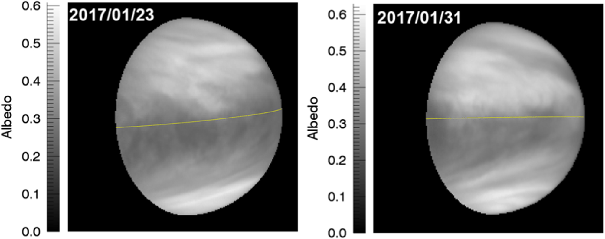 Figure 3. Occasionally appearing hemispheric asymmetry of the 365 nm albedo across the equator, observed on 2017 January 23 (left) and 31 (right) using the UVI on board Akatsuki. The yellow line is the equator, and north is up.