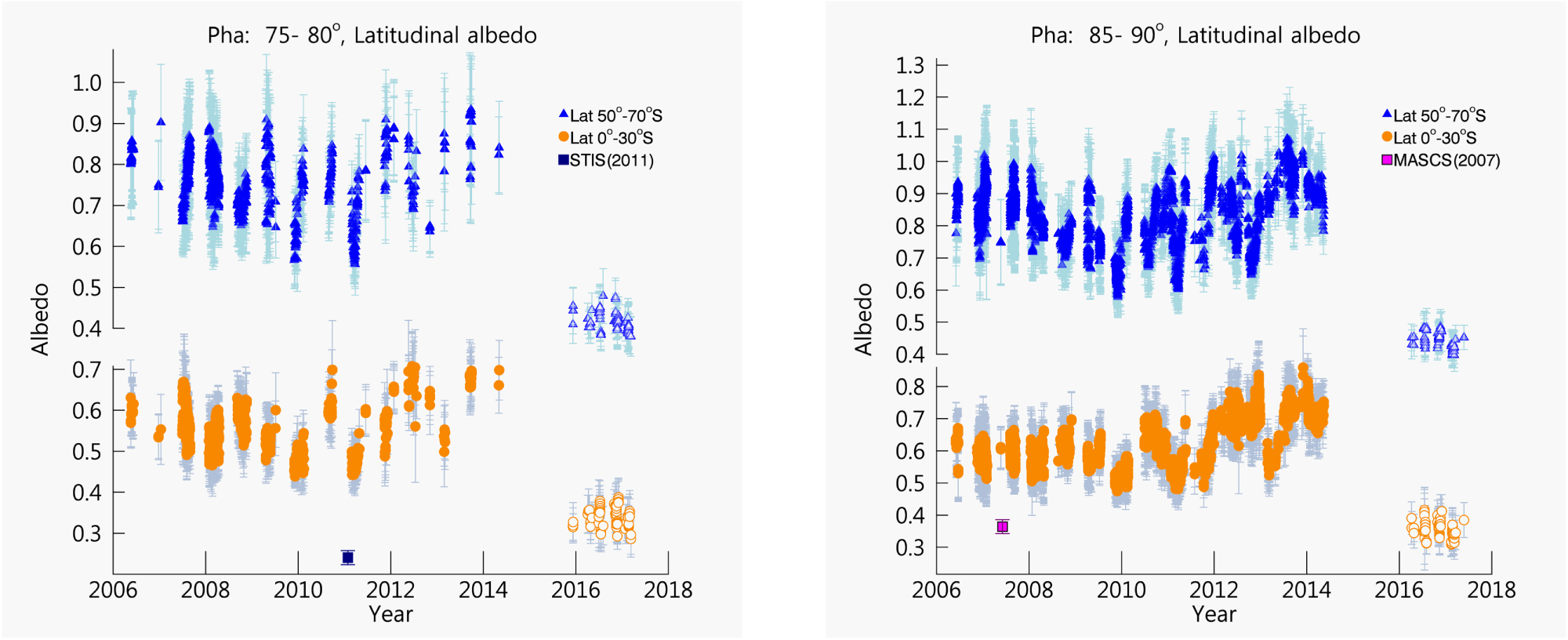 at low and high latitudes as a function of time, where phase angles from 50° to 110° are represented according to the color bar at the top of each panel. The overall decline in the 365 nm albedo from 2006 to 2011 remains apparent. Additionally, relatively sharp albedo declines are observed at the ends of 2009 and 2010, and the beginning of 2013 that remain constant over short time periods (∼months) before returning to the