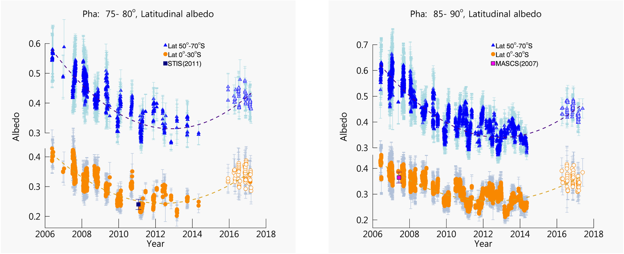 Figure 5. Long-term variations of the 365 nm albedo from 2006 to 2017 based on VMC (filled symbols), UVI (open symbols), STIS (navy square), and MASCS (magenta square). The low- (0–30°S) and high- (50–70°S) latitudinal mean albedo observed at the 75°–80° and 85°–90° phase angles are shown in the left and right panels, respectively. A polynomial fit of temporal variation in the derived latitudinal mean albedo (dashed lines) highlights the overall temporal trend. Error bars are standard deviations of albedo.