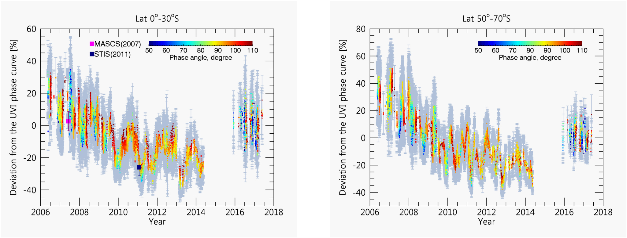 Figure 9. Relative temporal variations of mean A compared to the 2016–2017 phase curve, defined as Equation (12), at low (left) and high (right) latitudes. Vertical bars are standard deviations of mean A. The colors of the dots indicate phase angles between 50° and 110°, shown in the color bar. MASCS (2007) and STIS (2011) at low latitudes are shown with square symbols.