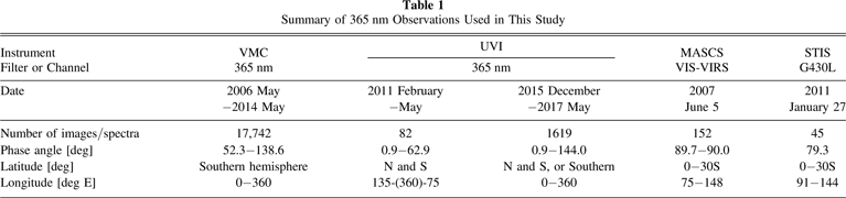 The MASCS in 2007, and STIS and UVI in 2011 data overlap observations with VMC data in 2007 and 2011. This is important for radiometric comparisons, as all three performed star observations and retrieved radiometric uncertainties independently. The VMC data are highly uncertain in terms of radiometric calibration, as the star observations revealed an 82% error (Titov et al. 2012; Shalygina et al. 2015). Cross-calibration between the VMC and the Visible and Infrared Thermal Imaging Spectrometer (VIRTIS) on board Venus Express was conducted using simultaneous overlapped spectral range observations between VIRTIS and the VMC (Titov et al. 2012; Shalygina et al. 2015). However, the absolute calibration of VIRTIS was not available at the time of these publications, resulting in questions about this cross-calibration (Lee et al. 2015a). Comparisons in our study show that this VMC and VIRTIS cross-calibration factor and the retrieved sensitivity degradation ratio of the 365 nm filter results in too large a difference in the VMC data with respect to MASCS, STIS, and UVI (Section 3.1.4). This will be discussed in detail (Section 3).