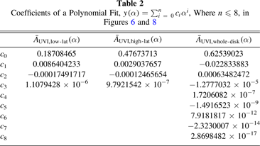 , which is derived as a polynomial fit of UVI data in 2016–2017 in the 50°–100° phase angle range (Figure 8). Table 2 shows the coefficients of the polynomial fit to the mean phase curves at low and high latitudes. Deviations from the UVI phase curve are defined as