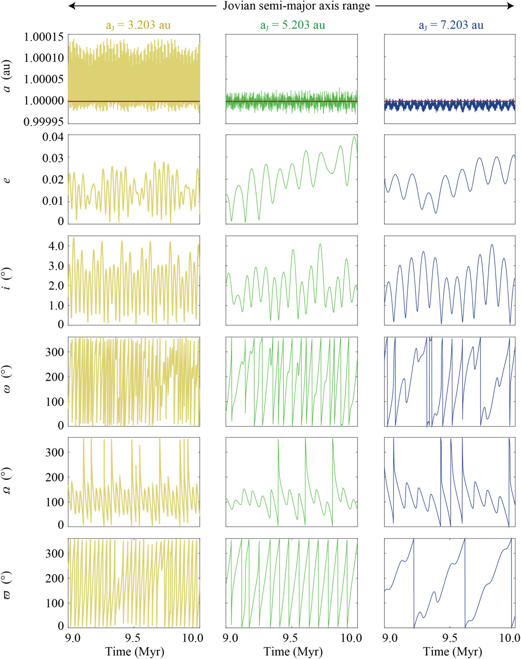 In Figure 1, we show the evolution of the Earth's orbital elements over the last million years of our simulations for three exemplar cases. The three scenarios feature "Jupiters" initially located at 3.203 au (left), 5.203 au (center), and 7.203 au (right), while Jupiter's initial orbital eccentricity was set to 0.0 and initial values of the four other orbital elements were set to their canonical values. This figure highlights the degree to which changes in Jupiter's orbit can impact both the amplitude and frequency of the Earth's orbital cycles.