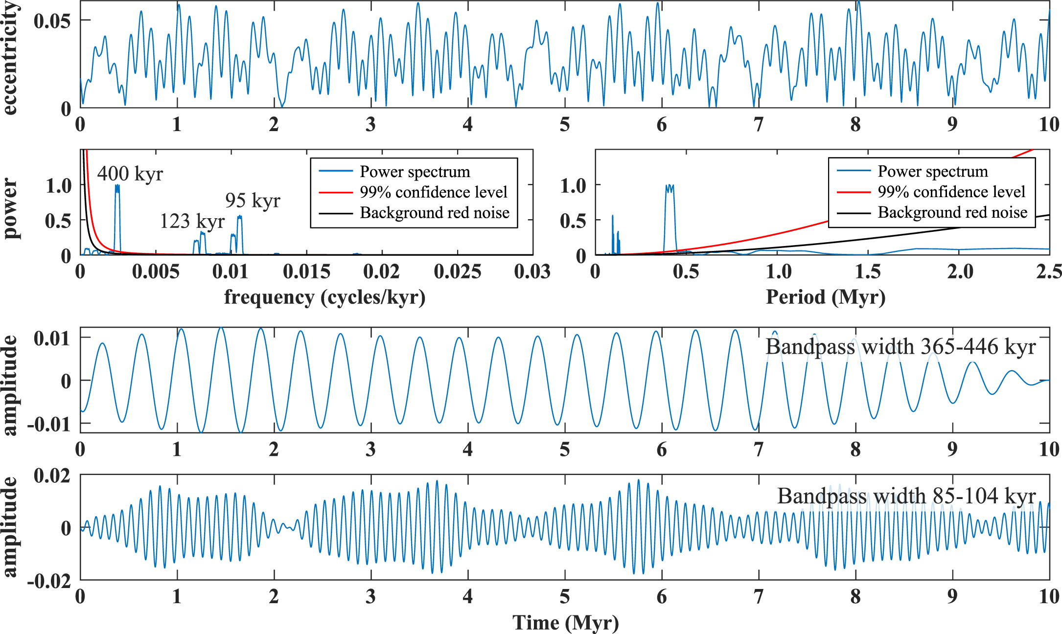 Standard image High-resolution imageFor validation, we applied these methods to the simulation in which Jupiter's location and eccentricity most closely resemble its "real" values (Figure 3). The most pronounced cycles that result for Earth's eccentricity have periods of 400, 123 and 94 kyr, consistent with earlier calculations (e.g., Laskar et al. 2004). Likewise, the associated simulated amplitudes for Earth's eccentricity are also in good agreement with the expected values.