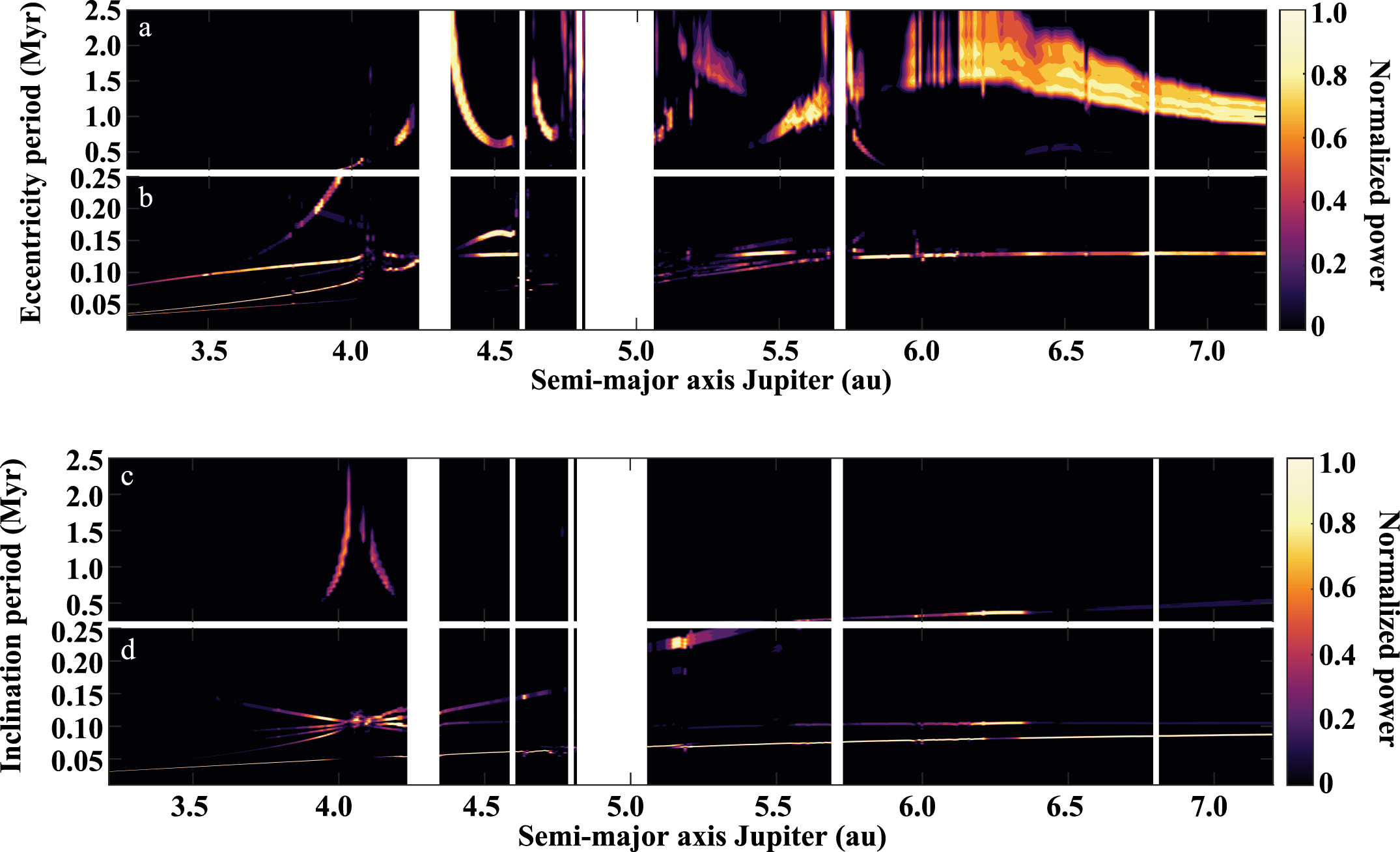 Cycles in Earth's orbital inclination are generally shorter than eccentricity cycles (Figure 4, panels (c) and (d)). The period of the dominant cycle increases from 30 to 85 kyr when Jupiter is moved outward. The disruption around 4.1 au is clearly visible. Multiple short cycles converge at this point, while a strong peak appears in the longest cycle that rapidly rises from 500 kyr to 2.5 Myr, before falling back to ∼500 kyr. At this location, the Earth's inclination cycles exhibit large oscillations (sometimes greater than 10°). However, in contrast to the aperiodic variability in Earth's eccentricity, these cycles appear to be steady over time throughout the 10 Myr simulation.