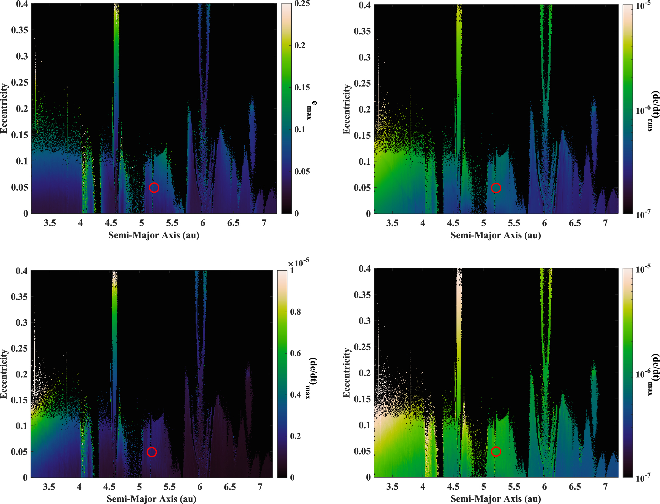 In Figure 5, we show the impact of Jupiter's orbit on the time evolution of Earth's orbital eccentricity. The regions in black in those plots are those for which the solar system proved unstable in our simulations. The data plotted in the top left panel of that figure reveal that, through most of the phase-space studied, Earth's maximum orbital eccentricity remains low, less than 0.1. However, there are small regions in which the solar system is stable on the timescale of our integration, but Earth's eccentricity can be forced to larger values. In the main, these regions are those on the edge of stability, and it is quite possible that those systems would have become unstable with longer simulation time. Of perhaps more interest are the panels in Figure 5 showing the rate of change of Earth's orbital eccentricity. As Jupiter is moved closer to the Sun, both the mean and maximum rate of change of our planet's orbital eccentricity increase, a finding mirrored in the left-hand column of Figure 1.