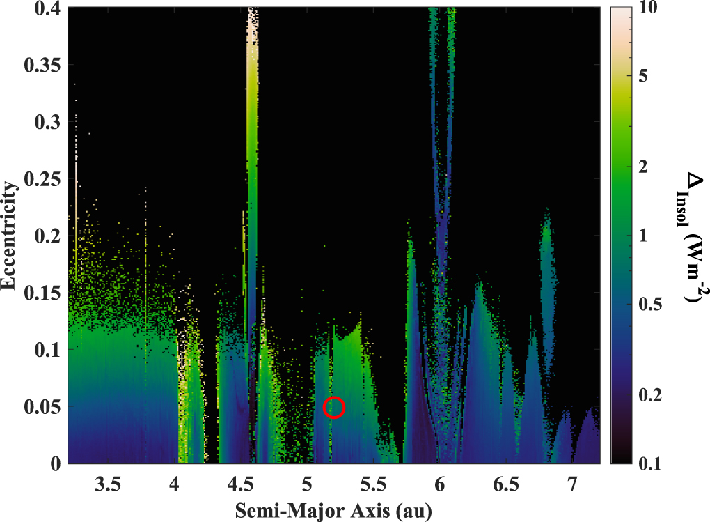Finally, we note for posterity the extremes in the variability observed across our dynamical stable ensemble of simulations. Across those 41,652 runs, the largest eccentricity obtained by the Earth was 0.415 in the scenario where Jupiter was initially located at a semimajor axis of 4.04 au and had an eccentricity of 0.168. Such an extreme eccentricity value for the Earth would result in an increase in the annual mean solar flux of around 10%, or 24 W m−2 when also accounting for our planet's modern albedo—a significant change compared to the 0.2% variation received by Earth over the eccentricity timescales associated with the glacial–interglacial fluctuations.