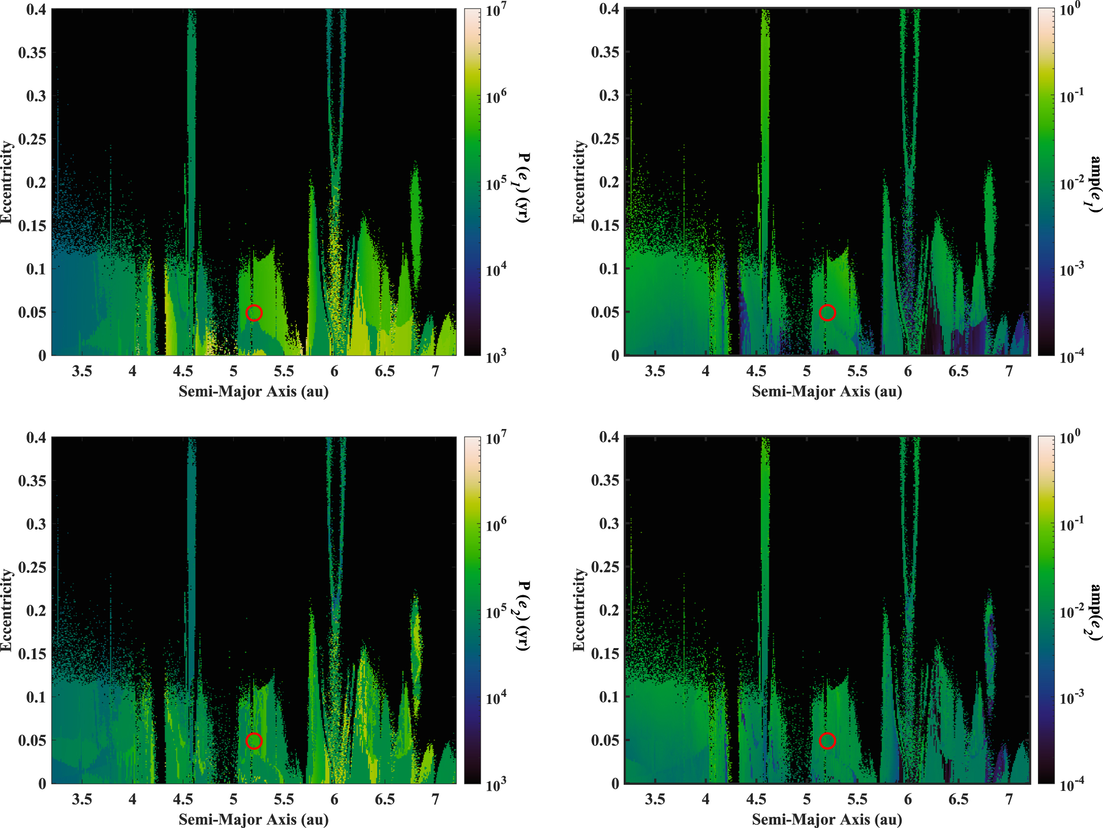 The orbital elements for the planets were obtained from the Horizons DE431 ephemeris, and converted from Cartesian to Keplerian coordinates through Mercury, by running a short simulation and outputting the Keplerian elements at t = 0. These Keplerian elements were then used as the basis for our grid of Jovian orbital solutions. In total, we tested 399 unique values of Jupiter's semimajor axis, covering a 4.0 au range centered on the initial semimajor axis of Jupiter in "our" solar system (a ∼ 5.203 au). For each of these 399 semimajor axes, we tested 399 unique values of Jovian orbital eccentricity, ranging from circular orbits (e = 0.0) to ones with moderate eccentricity (e = 0.4). While such an upper bound might seem unusually high, we note that there is a growing body of exoplanets that have been found on orbits far more eccentric than this (e.g., Wittenmyer et al. 2007, 2017b; Tamuz et al. 2008; Harakawa et al. 2015). Even in the solar system, it has been suggested that the eccentricity of Mercury's orbit can exceed this value, as part of its own long-term periodic variability (e.g., Strom & Sprague 2003; Correia & Laskar 2009).