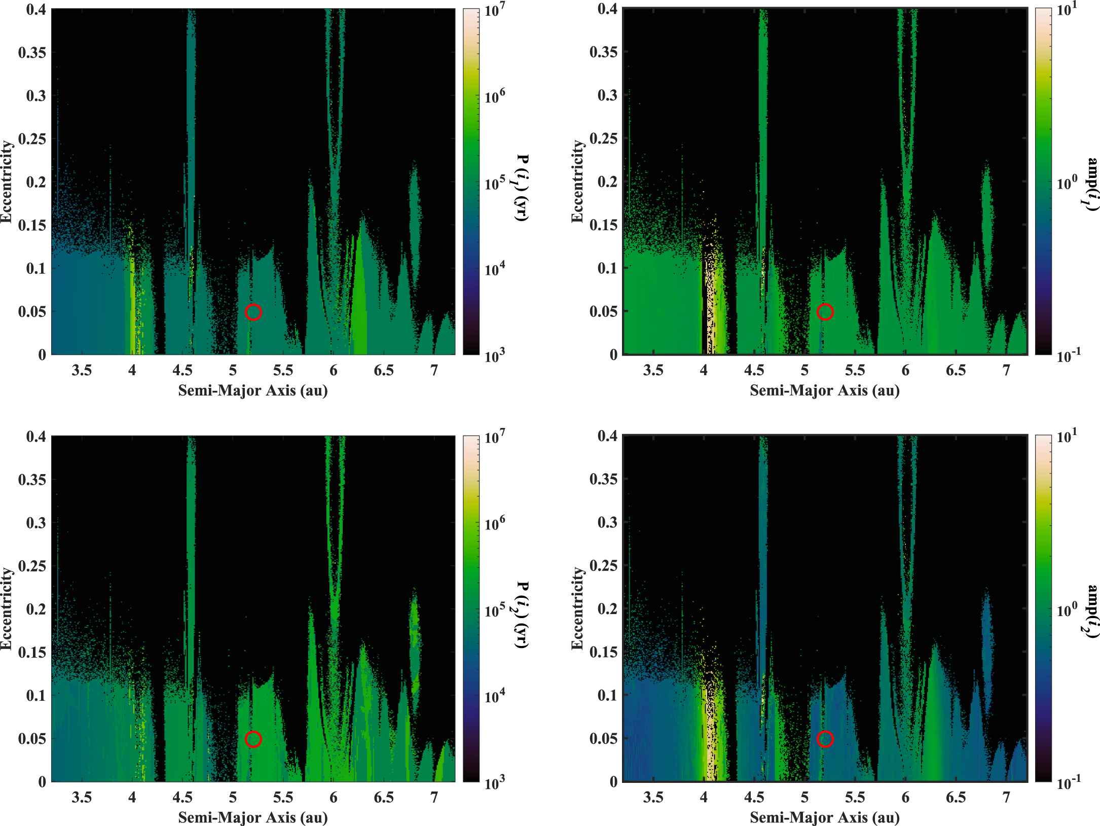 Standard image High-resolution imageFigure 9. The period and amplitude of the two dominant oscillations in Earth's orbital inclination, as a function of Jupiter's initial semimajor axis, a, and eccentricity, e. The left-hand plots show the period (in years) of the two dominant frequencies, while the right-hand plots show their amplitudes.