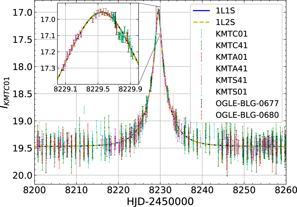 As can be seen in Figure 1, there is a small anomalous feature in the light curve relative to the 1L1S model that occurs over ∼5 hr during the interval 8229.70–8229.90. The anomaly primarily takes the form of a dip of ∼0.05 mag followed by a smaller and shorter bump. See the residuals in Figure 2. These features are well traced by the KMTC01 and KMTC41 data sets, and they are confirmed by two points from the OGLE-2018-BLG-0680 data, one each on the dip and the subsequent small bump. The OGLE-2018-BLG-0677 data set has a single point just before the start of the anomaly. We have examined the direct and difference images from KMTC and are satisfied that there are no systematic effects that can be attributed to seeing, background, or image cosmetics that could cause these features. Additionally, we have found no evidence that the dip is a repeating phenomenon, such as might be due to a starspot.