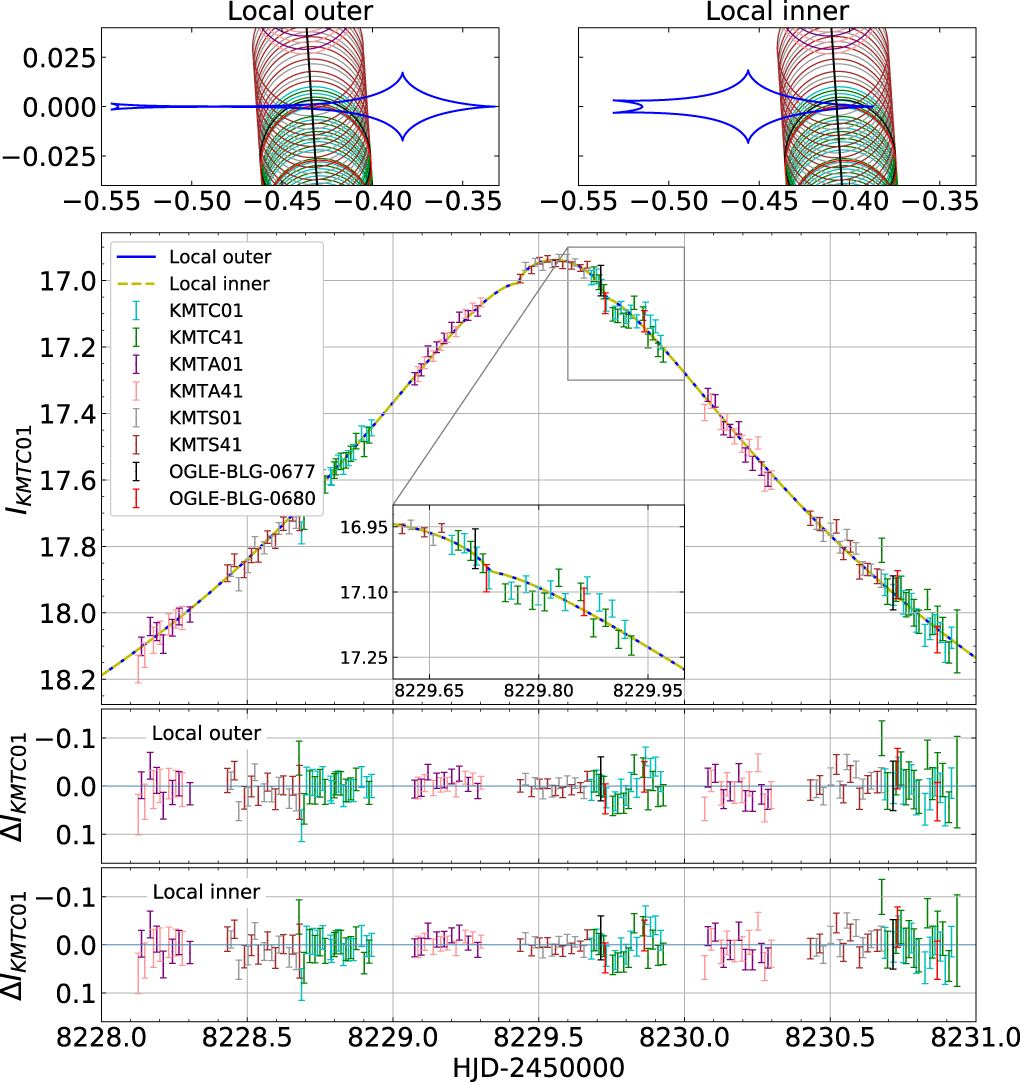 introduced by Hwang et al. (2017), which traces the offset between the centers of the source and the major-image caustic as the source crosses the planet–star axis. Three of the identified extra solutions are located within the purple region below the best-fit solutions, with 25 < Δχ2 < 36, and are indistinguishable from their surroundings. The two remaining local minima, i.e., those displayed in Figure 4 and labeled as outer and inner local minima in Figure 5, have 16 < Δχ2 < 25. They are degenerate, and correspond to lens mass ratios ∼ twice that of the best solutions. They each represent a source trajectory over an on-axis cusp that provides a single bump in magnification, and correspond to a major-image perturbation with degeneracies as discussed in Gaudi & Gould (1997).