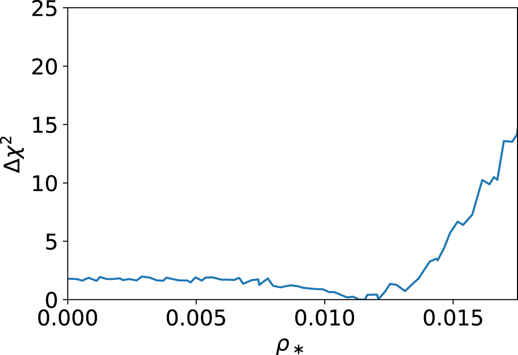 Figure 8. Minimum Δχ2 as a function of ρ* using the chains derived from the light-curve fitting MCMC. This shows that ρ* is weakly detected as there is clearly an upper limit for it, but the difference from a flat region on the smaller values is only Δχ2 ≈ 1.7.