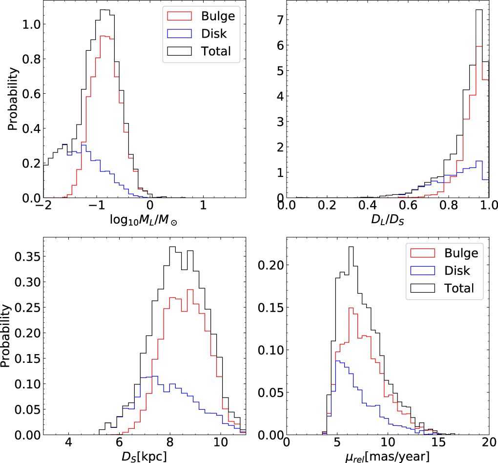, the source distance DS, and μrel. In addition to the total, the four panels show also the separate bulge and disk distributions, normalized to the total.