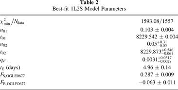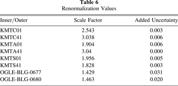 for each data set are determined in such a way that the reduced χ2 for both the higher- and lower-magnification data points for each site are approximately unity (Yee et al. 2012). The renormalization factors are listed in Table 6. The MCMC search was then re-run with the renormalized data uncertainties to corroborate the solution and obtain a new minimized χ2. The final model parameter values and their uncertainties are directly obtained from the 68% confidence interval around the medians of the marginalized posterior parameter distributions.