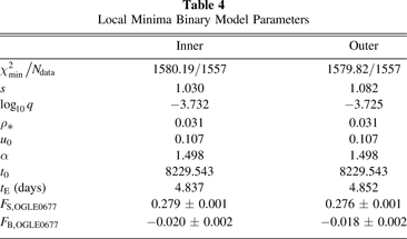 We also presented the fit for binary lens solutions. These suffer from a two-fold inner–outer(close-wide) degeneracy, but we found that the ratio of masses was similar for both, indicating that the lens is composed of a star plus planet system. Formally, the planet is detected with a Δχ2 ≈ 46 and