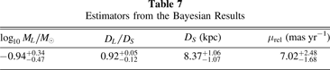 and q for the inner and outer solutions, the Bayesian analysis returns indistinguishable distributions, and for these reasons it is justifiable to say that both give the same derived planet mass distribution. This is not the case for the projected separation between host and planet, which has a small but not negligible difference. The derived distributions are shown in Figure 11 and their estimators in Table 8.