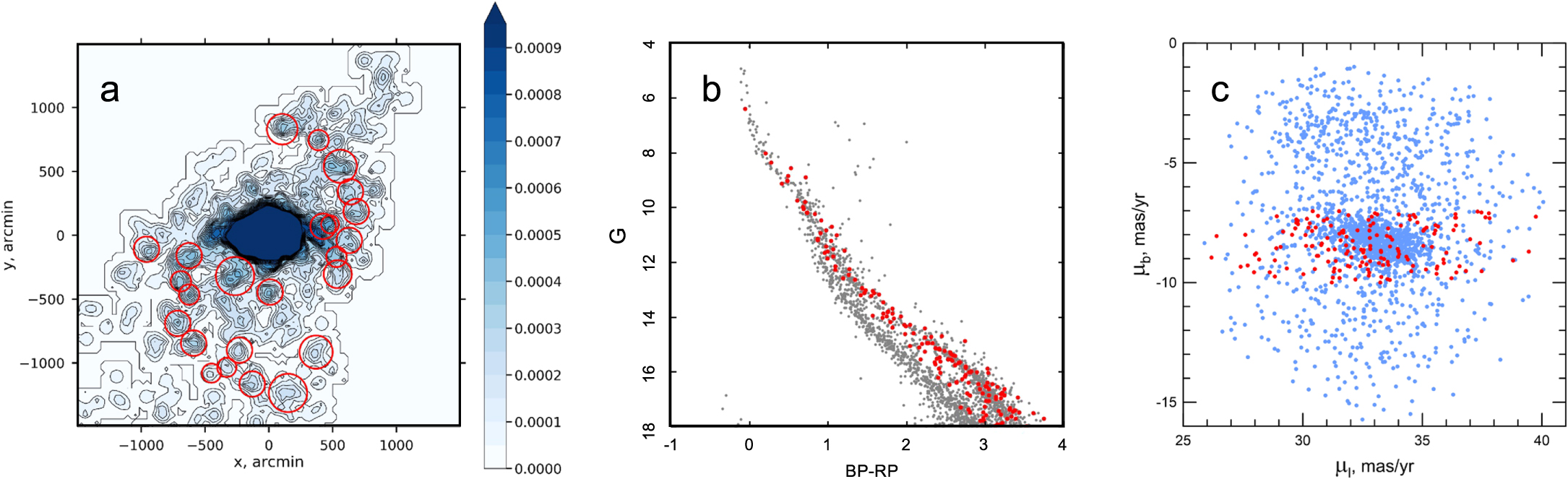 Figure 10. (a) Density map of the Sample 2, with the red circles marking the subgroups of the "tidal tails" (designations are the same as in Figure 2(b)). (b) CMD for these stars (red points) comparing the CMD position of the cluster and the stream stars (see the right panel of Figure 4). (c) The proper motion diagram for the cluster (C2) stars (blue dots) and stars of the "tidal tails" (red dots).