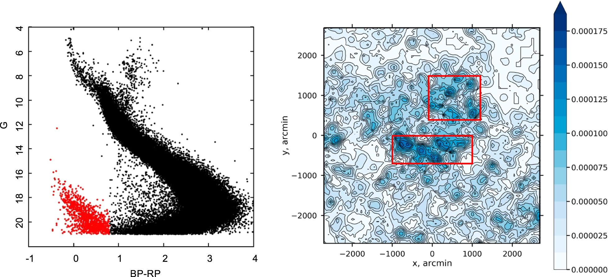 Figure 11. The left panel shows the CMD of Sample 1 without the limit on the stellar magnitude (Sample 1a), with WD candidates marked by red. The right panel shows the density map for WD candidates. For the stars within the red rectangles, the distance distributions are shown in Figure 12.