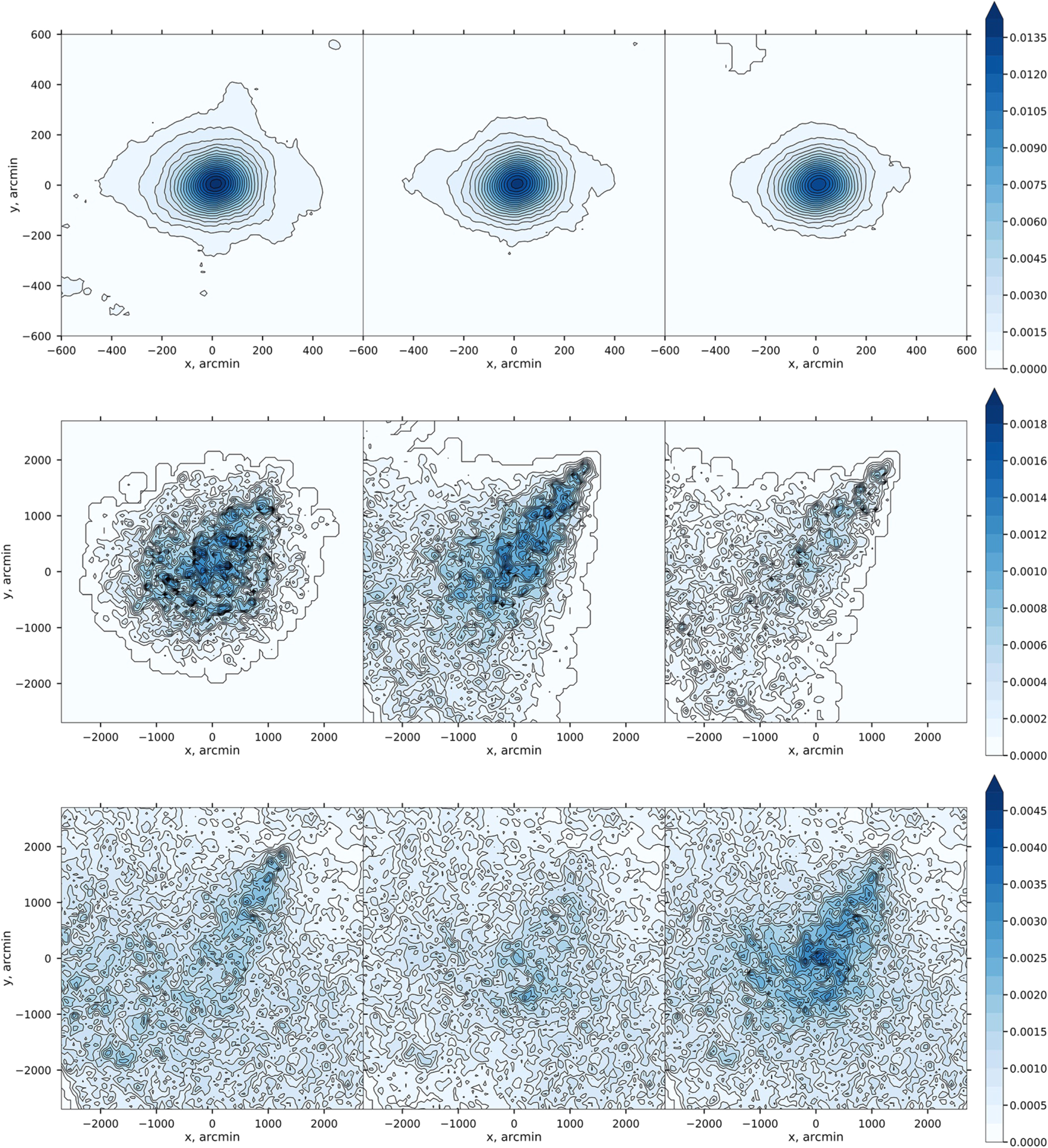 The outcome of the three different selection criteria (C1, C2, and C3) can be analyzed using stars' surface density maps (see Figure 3). All these maps were plotted by KDE with the kernel half-width of h = 120'. The effectiveness of the selection in particular can be tested against the general field stars' distribution, which ideally should be uniform. The selection C2 clearly provides the best result from this point of view. The cluster corona is elongated along the Galactic longitude. However, in the inner part of the cluster, the density contours are aligned with the cluster velocity vector (see Figure 1 for a comparison).