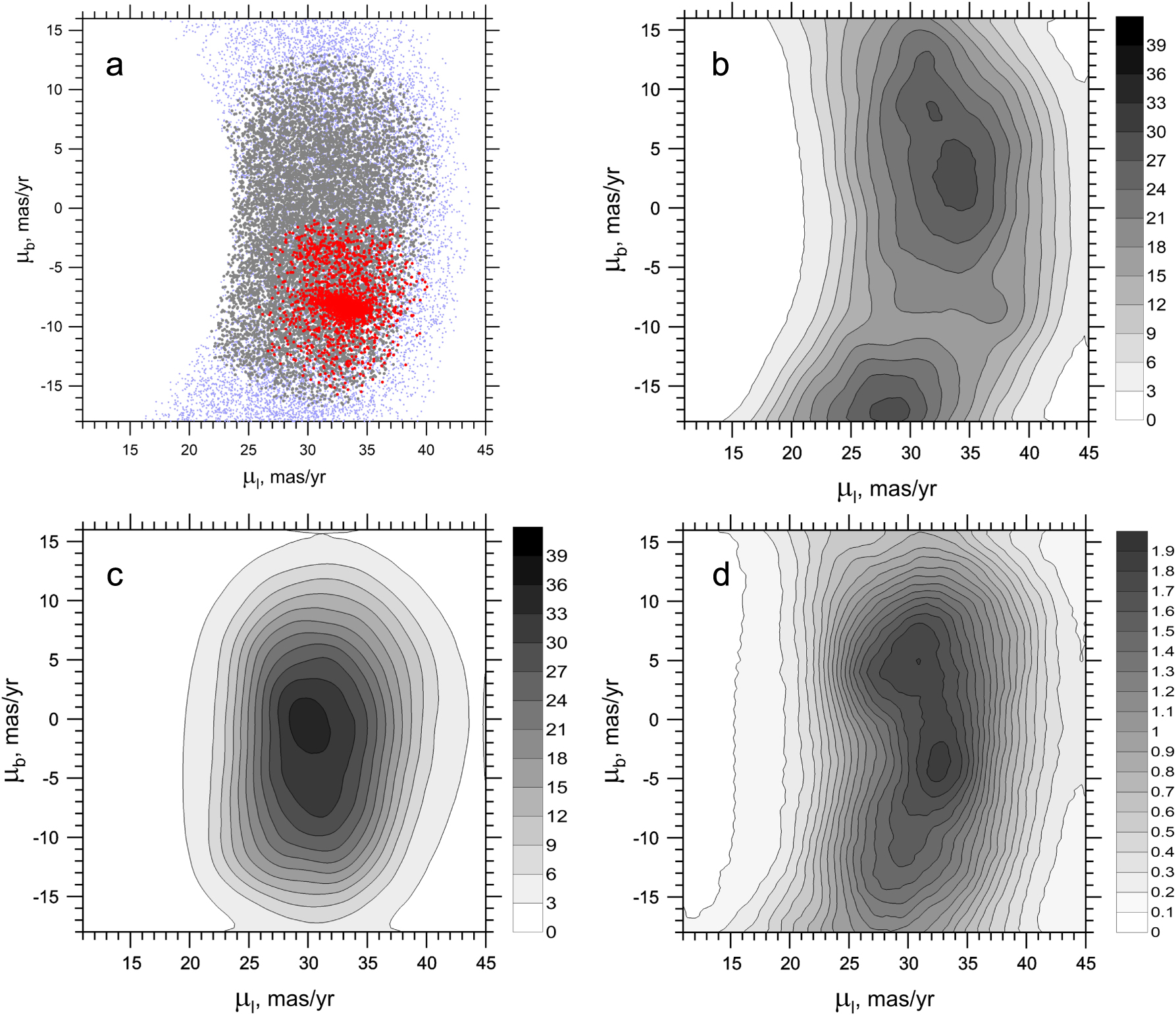 mas yr−1; these mean values were taken approximately from the diagrams "parameter-G"). We controlled this iterative process by monitoring visually the color–magnitude diagram (CMD) of the residual sample at every step. We terminated the process when the cluster sequence emerged clearly in the CMD against a minimum field star contamination. The final limits on the parallaxes and the proper motions are: π ∈ [5.05; 6.35] mas, μl ∈ [26; 40] mas yr−1, μb ∈ [−11; −6] mas yr−1.