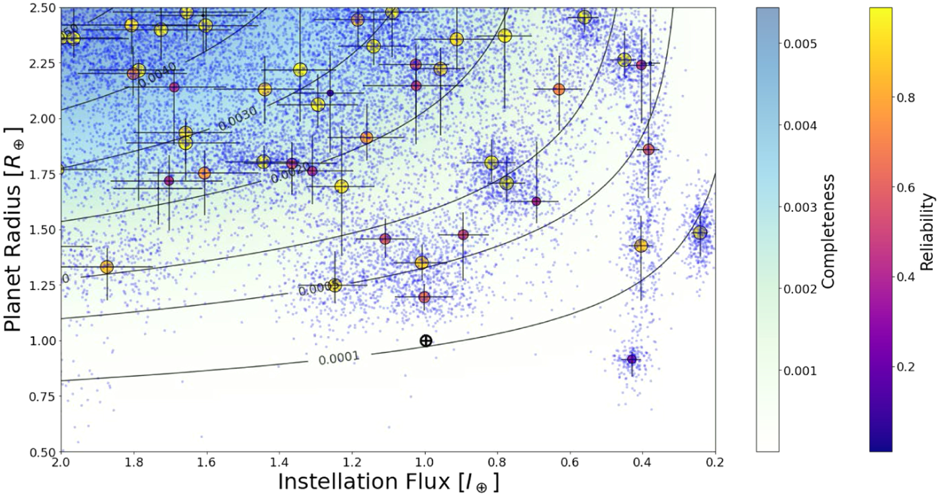 Figure 1. Two views of the DR25 planet candidate population with radii smaller than 2.5 R⊕ and instellation flux near the host star's HZ around main-sequence dwarf stars. Top: Instellation flux versus stellar effective temperature, showing the HZ and Kepler observational coverage. The background color map gives, at each point, the fraction of stars at that effective temperature and instellation flux that may have planets with orbital periods of 710 days or less, so it is possible to observe three transits. The contours show the fraction of planets with periods of 500 days or less, indicating available completeness measurements. The solid green lines are the boundaries of the optimistic HZ, while the dashed green lines are the boundaries of the conservative HZ (see Section 2). The planets are sized by their radius and colored by their reliability. Bottom: Instellation flux versus planet radius. The color map and contours show the average completeness for the stellar population (Section 3.3.1). The planets are sized and colored by reliability (Section 3.3.3), with radius and instellation flux error bars. In the lower panel the ⊕ symbol shows the Earth.