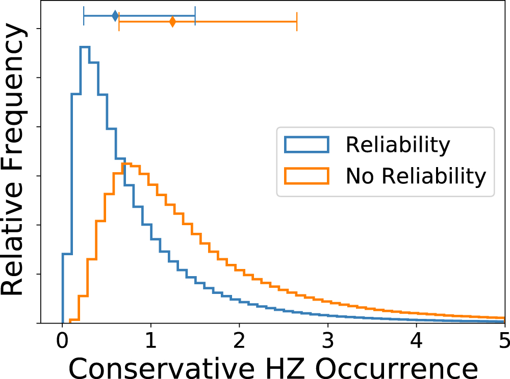 DR25 was the first catalog to include data products that allowed for the characterization of catalog reliability against false alarms due to noise and systematic instrumental artifacts, which are the most prevalent contaminants in the η⊕ regime. Thus nearly all previous works did not incorporate reliability against false alarms in their estimates. Bryson et al. (2020a) were the first to directly take into account reliability against both noise/systematics and astrophysical false positives and in doing so found that occurrence rates for small planets in long-period orbits drop significantly after reliability correction. Mulders et al. (2018) attempted to mitigate the impact of contamination by using a DR25 Disposition Score cut (see Section 7.3.4 of Thompson et al. 2018) as an alternative to reliability correction. As shown in Bryson et al. (2020b), while this approach does produce a higher-reliability planet catalog, explicit accounting for reliability is still necessary for accurate occurrence rates.
